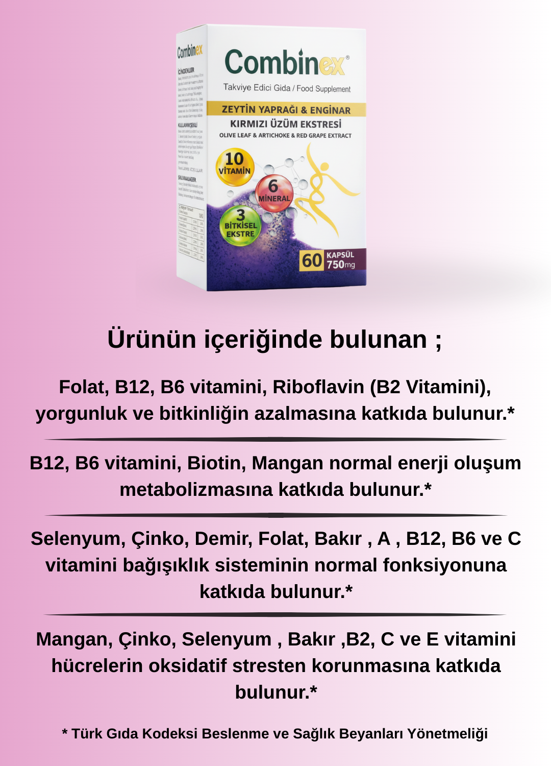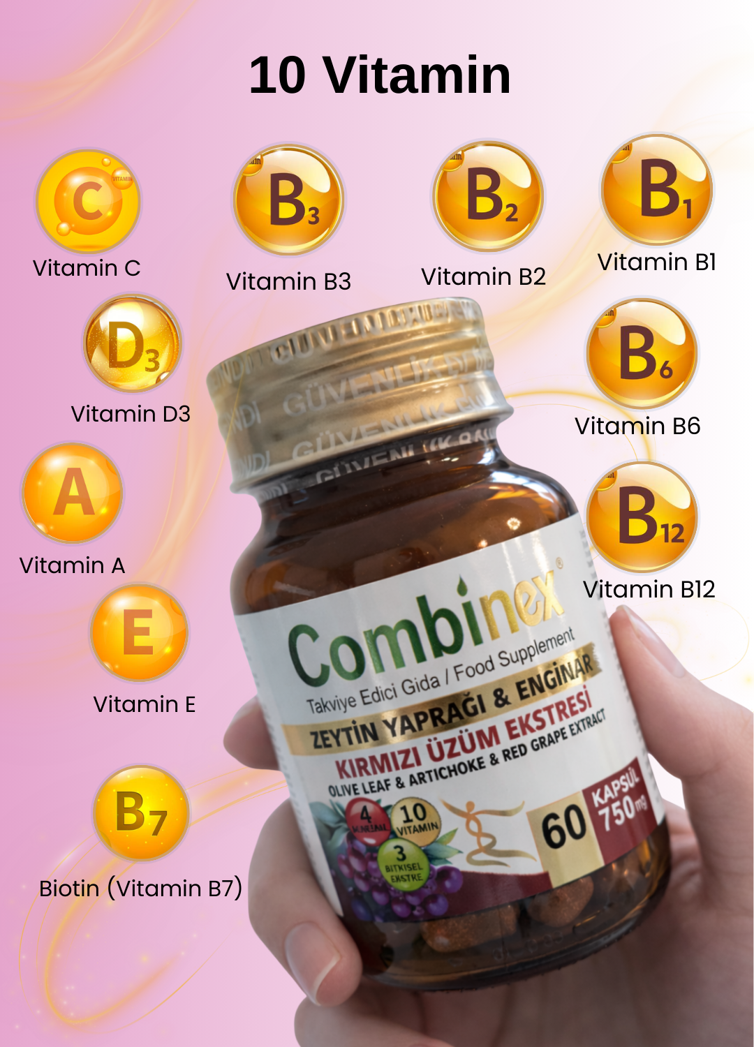 Combinex® 10 Vitamin ve 6 Mineral ile Zeytin Yaprağı, Enginar ve Kırmızı Üzüm Ekstreleri İçeren 60 Kapsül Takviye Edici Gıda