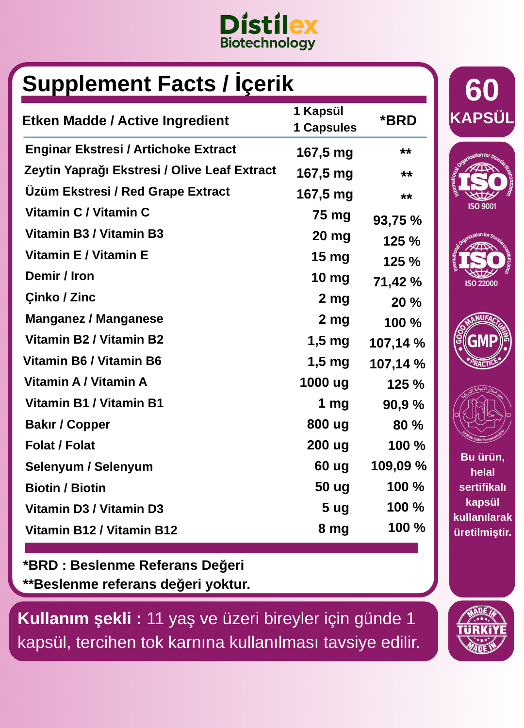 • B12, B6 vitamini, Biotin, Mangan normal enerji oluşum metabolizmasına katkıda bulunur.*