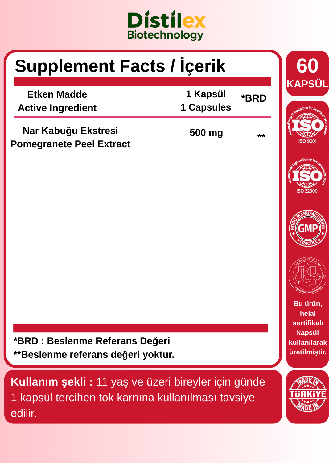 Tavsiye edilen günlük kullanım miktarını aşmayınız. Bu ürün takviye edici gıdadır, ilaç değildir. Hastalıkların önlenmesi, tedavisi veya iyileştirilmesi amacıyla kullanılmaz. Normal beslenmenin yerine geçmez. Hamilelik ve emzirme döneminde olanlar, kronik hastalığı bulunanlar veya düzenli ilaç kullananlar doktora danışmadan kullanmamalıdır. Çocukların ulaşamayacağı yerde saklayınız.